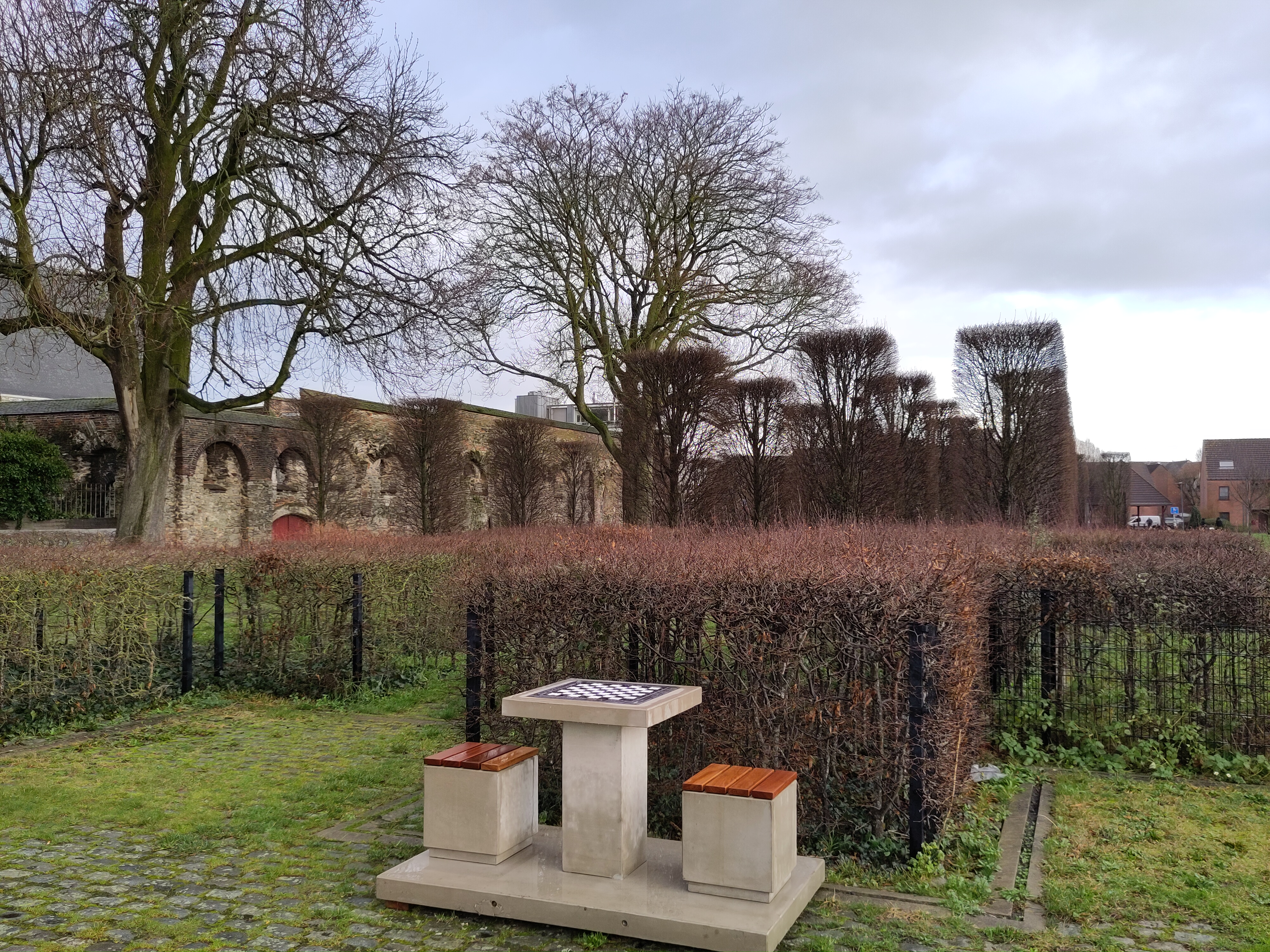 Hierna liepen we naar het Coyendanspark waar heel vroeger de Sint-Baafsabdij stond die door Karel V werd gesloopt en vervangen door een dwangburg. Van de dwangburg is daar nu nog een ruïne. die helaas alleen in de zomer te bezoeken is. De contouren van de kerk van de Sint-Baafsabdij is nu ook nagebouwd door bomen, zodat je toch een goed gevoel krijgt hoe de kerk er vroeger uitgezien moet hebben.